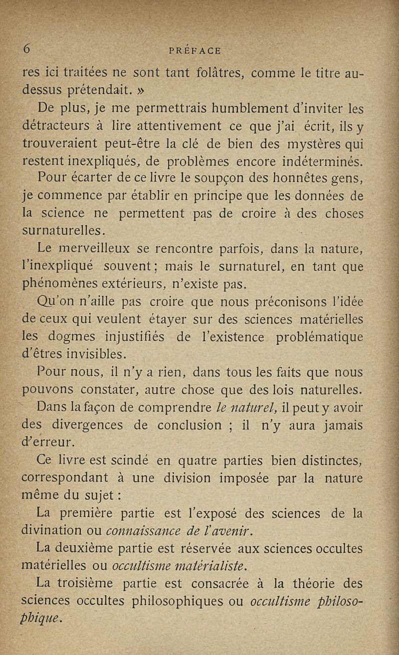 Les sciences occultes, divination, calcul des probabilités, oracles et sorts, songes, graphologie, chiromancie, phrénologie, physiognomonie, cryptographie, magie, kabbale, alchimie, astrologie, etc.