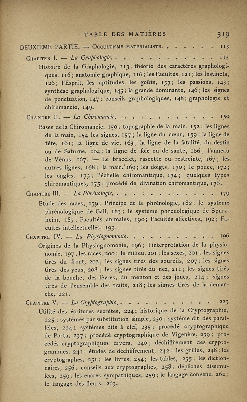 Les sciences occultes, divination, calcul des probabilités, oracles et sorts, songes, graphologie, chiromancie, phrénologie, physiognomonie, cryptographie, magie, kabbale, alchimie, astrologie, etc.
