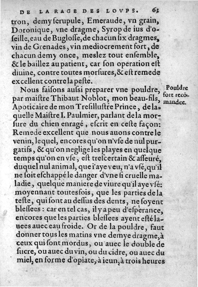 Histoire notable de la rage des loups, advenue l'an MDXC, avec les remedes pour empescher la rage, qui survient après la morsure des Loups, Chiens et autres bestes enragees. Le tout mis en lumiere par Jean Bauhind, Medecin de Tres-illustre Prince, Monsieur Friderich, Conte de Vvirtemberg, Mont. etc.,