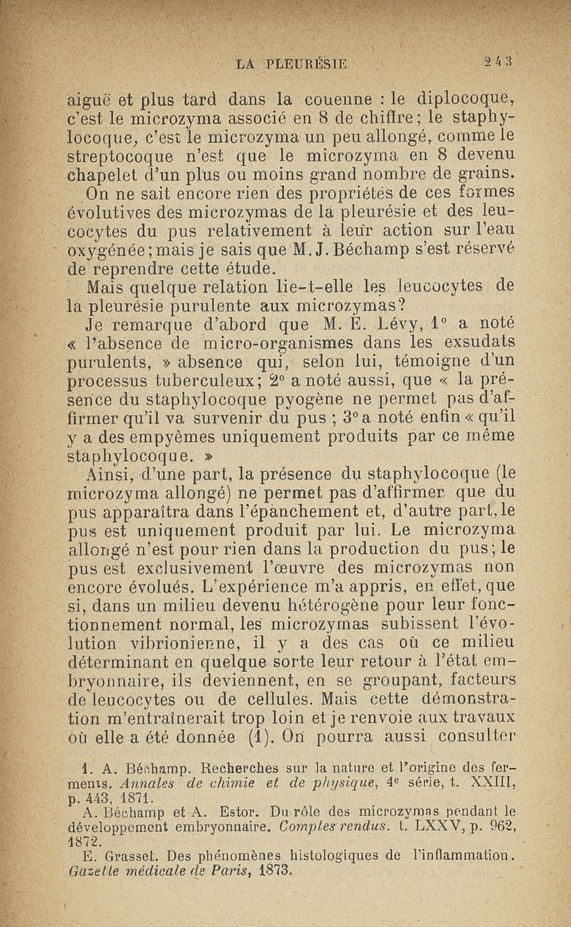 Microzymas et microbes : communications à l'Académie de médecine dans les discussions sur l'aigrissement et la coagulation spontanés du lait de vache,la septicémie puerpérale, la pleurésie, l'albuminurie