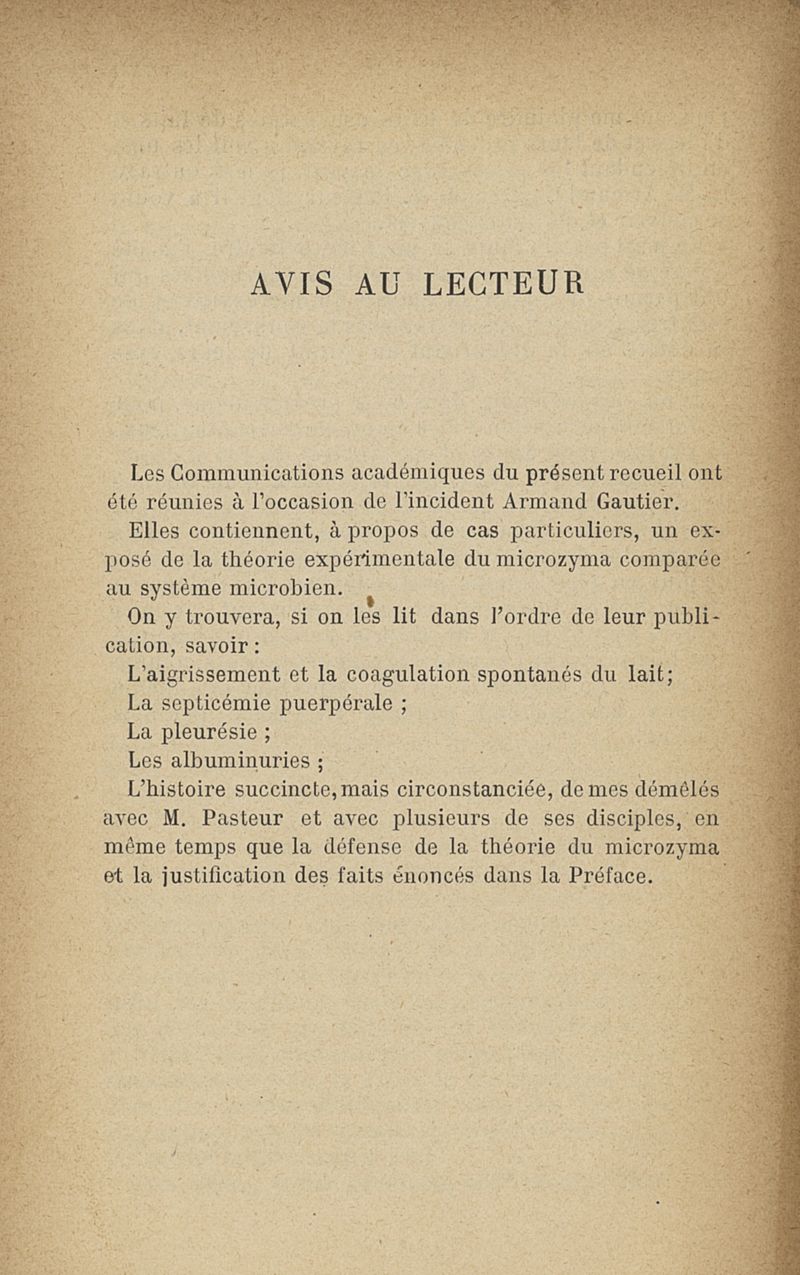 Microzymas et microbes : communications à l'Académie de médecine dans les discussions sur l'aigrissement et la coagulation spontanés du lait de vache,la septicémie puerpérale, la pleurésie, l'albuminurie