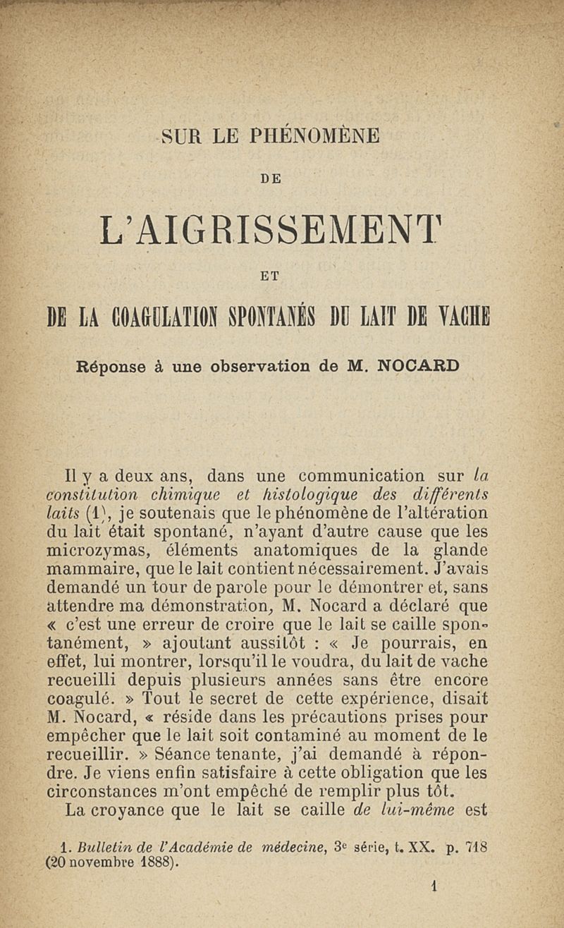 Microzymas et microbes : communications à l'Académie de médecine dans les discussions sur l'aigrissement et la coagulation spontanés du lait de vache,la septicémie puerpérale, la pleurésie, l'albuminurie