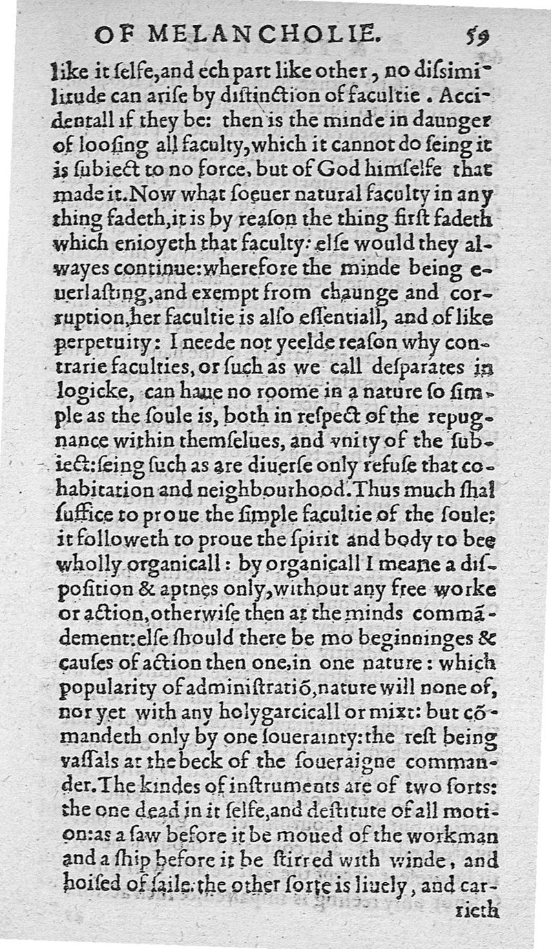 A treatise of melancholy. Contayning the causes thereof, and reasons of the straunge effects it worketh in our minds and bodies : with the phisicke cure, and spirituall consolation for such as have thereto adjoyned afflicted conscience. The difference betwixt it, and melancholy, with diverse philosophicall discourses touching actions, and affections of soule, spirit and body. By T. Bright Doctor of Phisicke