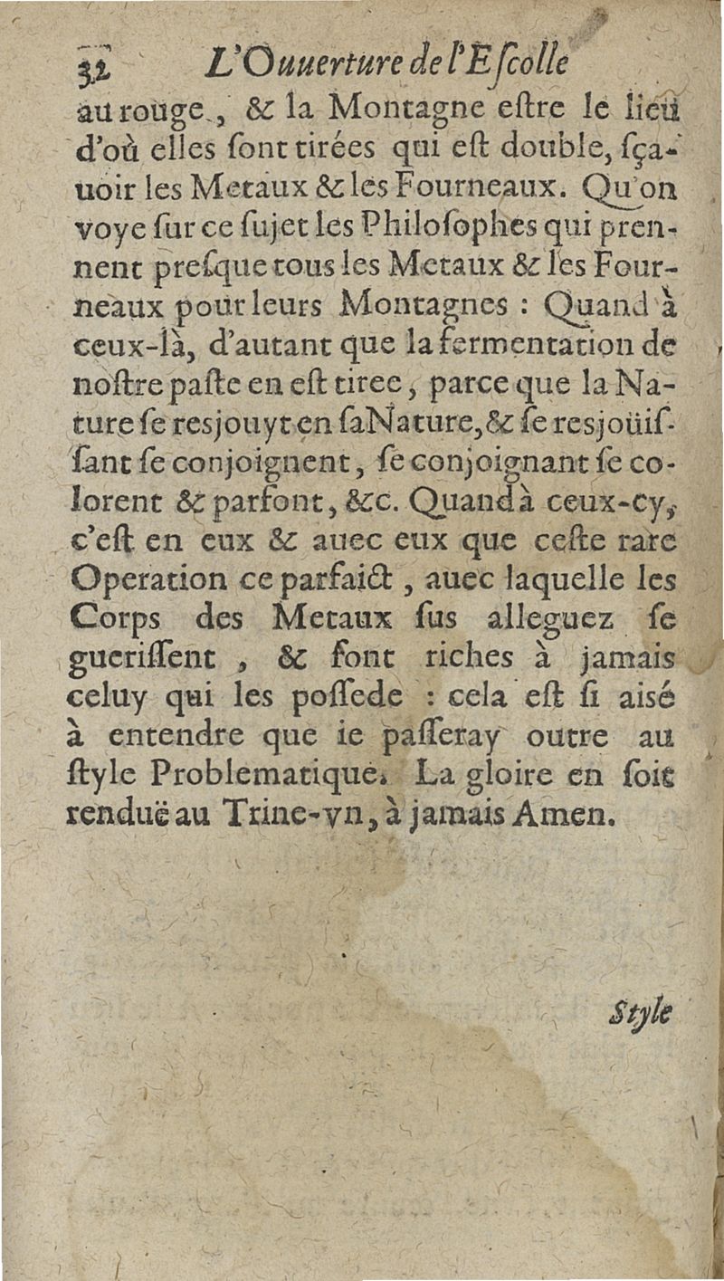 L'ouverture de l'Escolle de philosophie transmutatoire metallique ou la plus saine et veritable explication & consiliation de tous les stiles desquels les philosophes anciens se sont servis en traictant de l'oeuvre physique sont amplement declarées