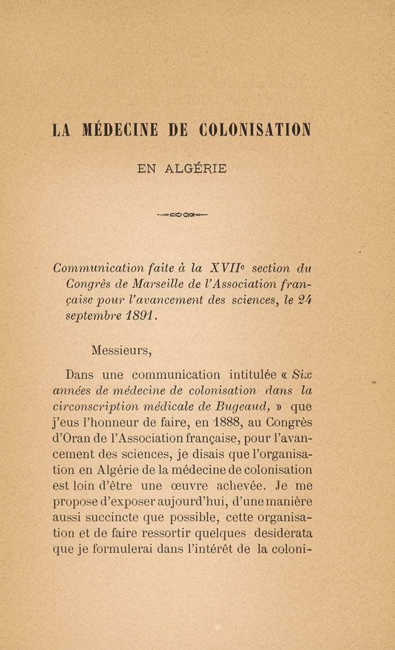 La Médecine de colonisation en Algérie