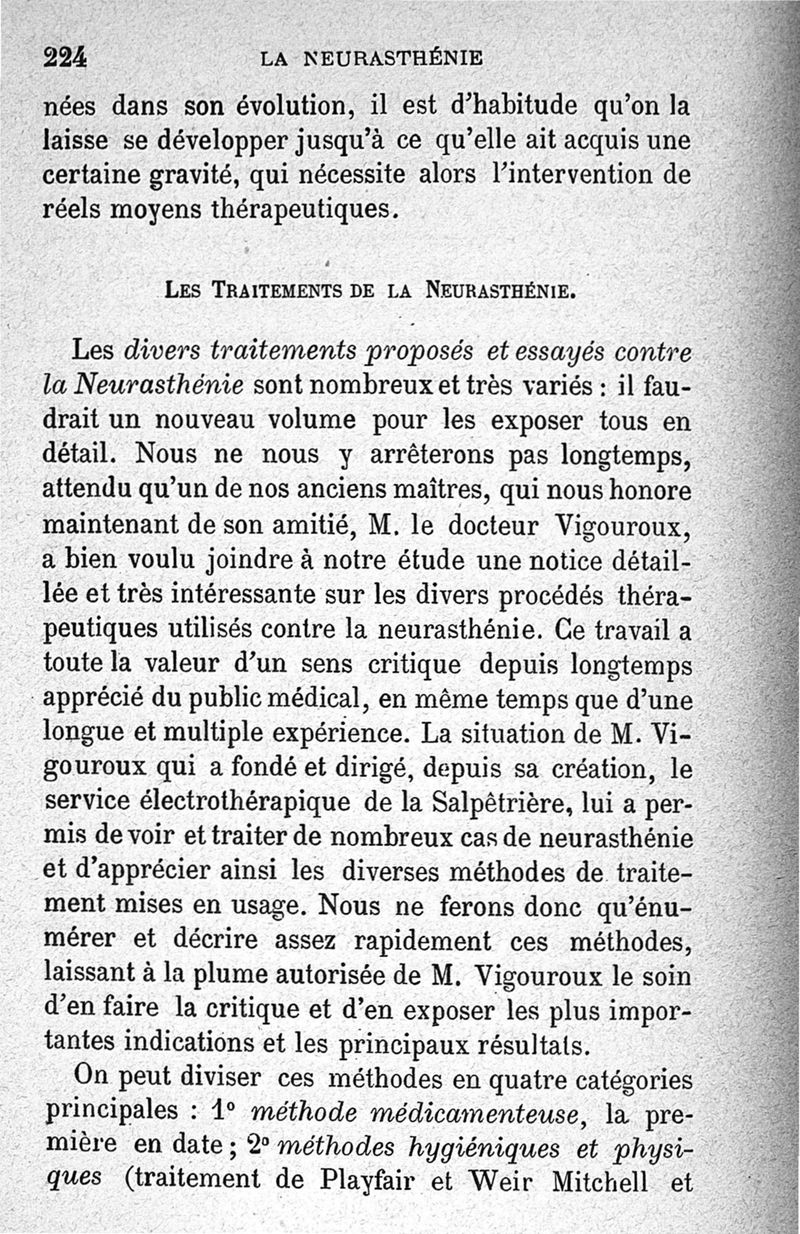 La neurasthénie, maladie de Beard, méthodes de Weir-Mitchell et Playfair, traitement de Vigouroux ; avec une préface du Pr Charcot et suivie d'une note thérapeutique par le Dr Vigouroux
