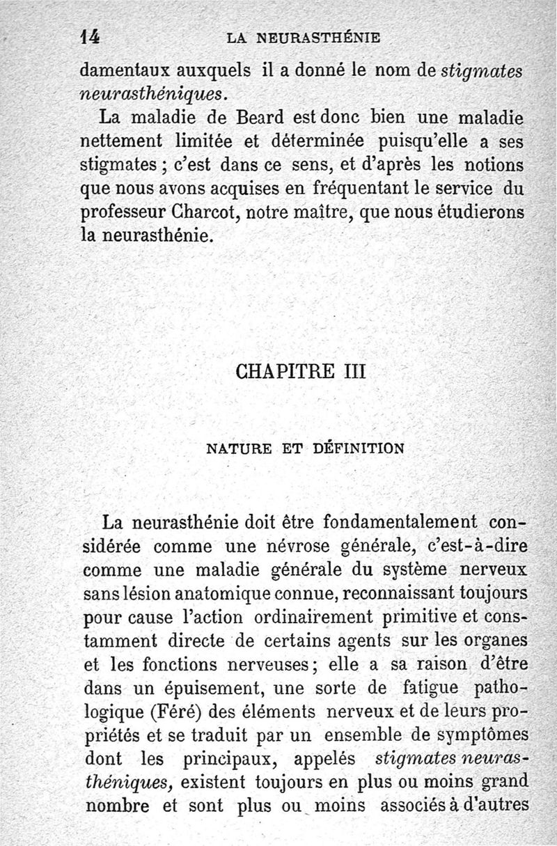 La neurasthénie, maladie de Beard, méthodes de Weir-Mitchell et Playfair, traitement de Vigouroux ; avec une préface du Pr Charcot et suivie d'une note thérapeutique par le Dr Vigouroux