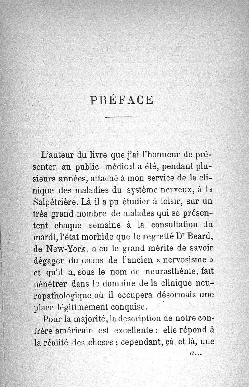 La neurasthénie, maladie de Beard, méthodes de Weir-Mitchell et Playfair, traitement de Vigouroux ; avec une préface du Pr Charcot et suivie d'une note thérapeutique par le Dr Vigouroux