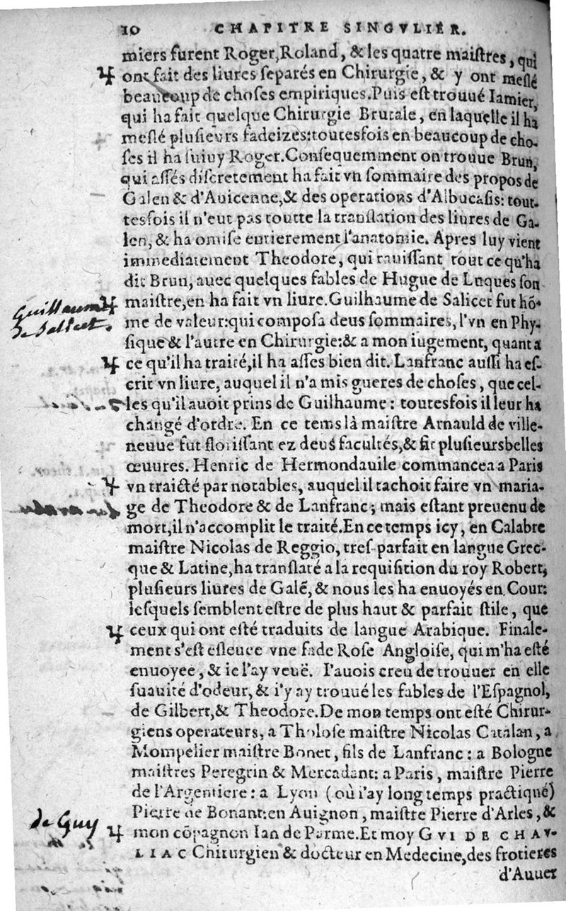 La grande chirurgie de M. Gui de Chauliac, Medecin tres-fameux de l’Université de Monpelier, composee l’an de grace M.CCC.LXIII. Restituee nouvellement a sa dignité, par M. Laurens Joubert, Medecin ordinaire du Roy, et du Roy de Navarre, premier Docteur regent stipendié, Chancelier et Juge de ladicte Université. Voyez au prochain feuillet, ce que M. Joubert ha faict (outre sa nouvelle traduction) et fourny du sien, en recognoissant cest’ œuvre,