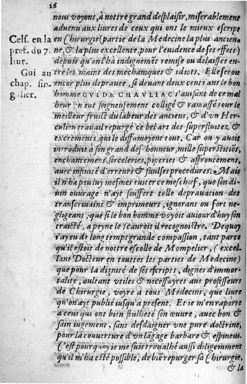 La grande chirurgie de M. Gui de Chauliac, Medecin tres-fameux de l’Université de Monpelier, composee l’an de grace M.CCC.LXIII. Restituee nouvellement a sa dignité, par M. Laurens Joubert, Medecin ordinaire du Roy, et du Roy de Navarre, premier Docteur regent stipendié, Chancelier et Juge de ladicte Université. Voyez au prochain feuillet, ce que M. Joubert ha faict (outre sa nouvelle traduction) et fourny du sien, en recognoissant cest’ œuvre,