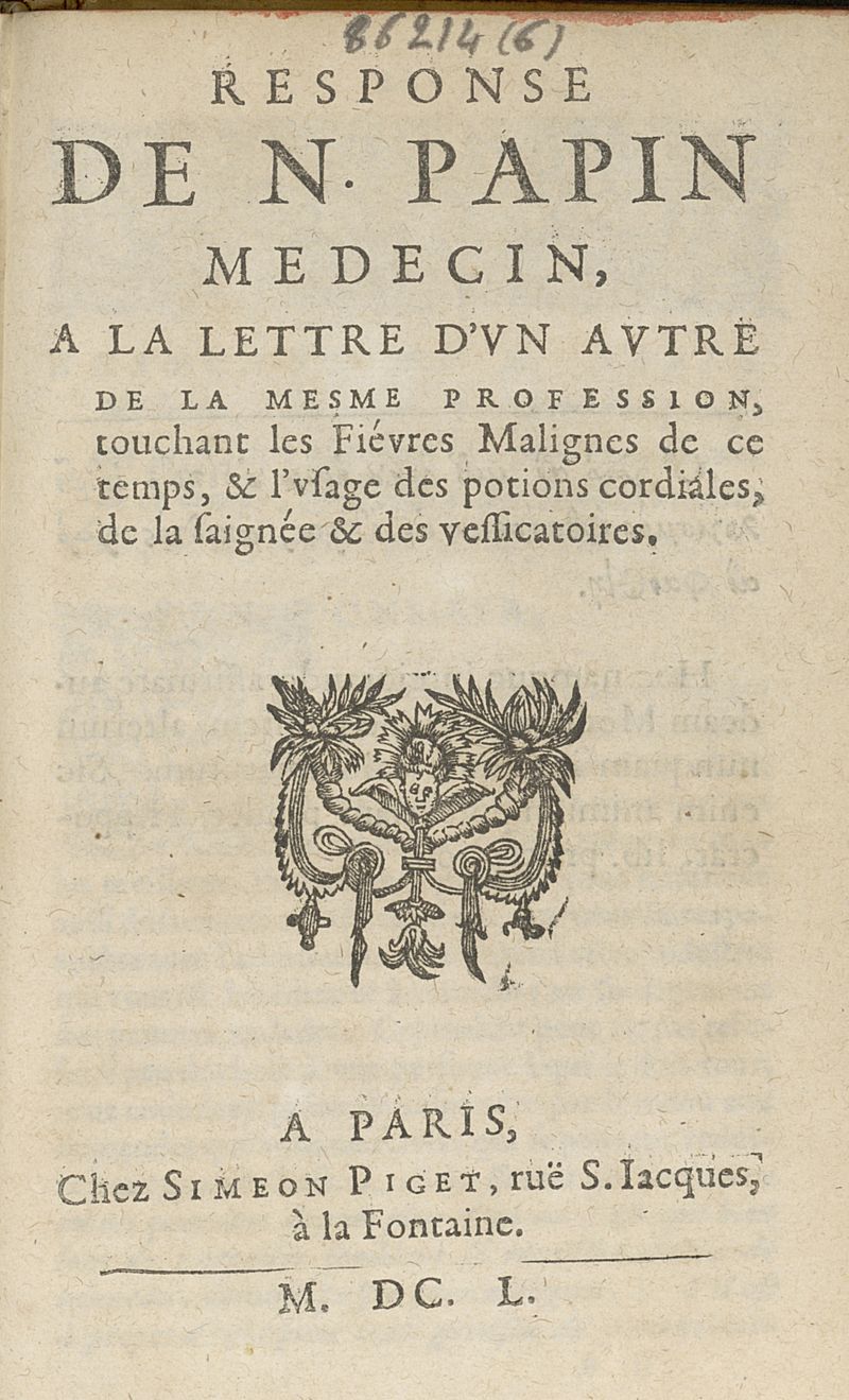 Response de N. Papin medecin, a la lettre d'un autre de la mesme profession, touchant les fièvres malignes de ce temps, & l'usage despotions cordiales, de la saignée & des vessicatoires