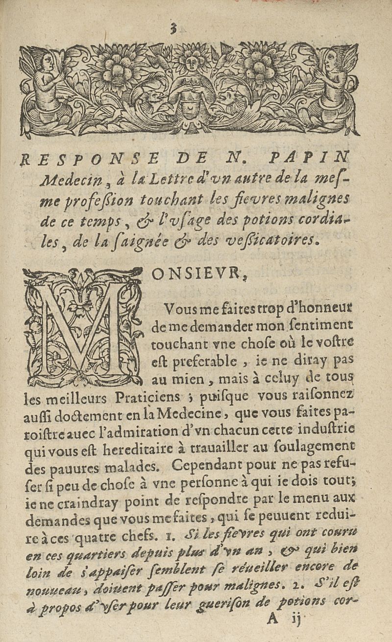 Response de N. Papin medecin, a la lettre d'un autre de la mesme profession, touchant les fièvres malignes de ce temps, & l'usage despotions cordiales, de la saignée & des vessicatoires