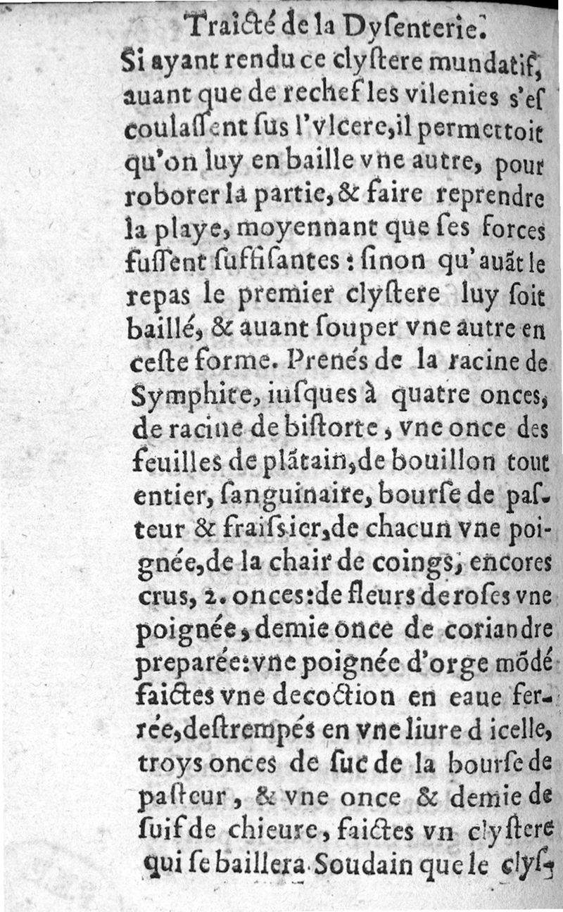 Traicté de la dysenterie, et cure d’icelle, divisé en deux parties : l’une contenant la maladie, Causes, et Symptomes d’icelle : l’autre la Curation. Composé par Guillaume Souviros, Docteur en la faculté de Medecine de Montpellier, et Medecin en Tolose,
