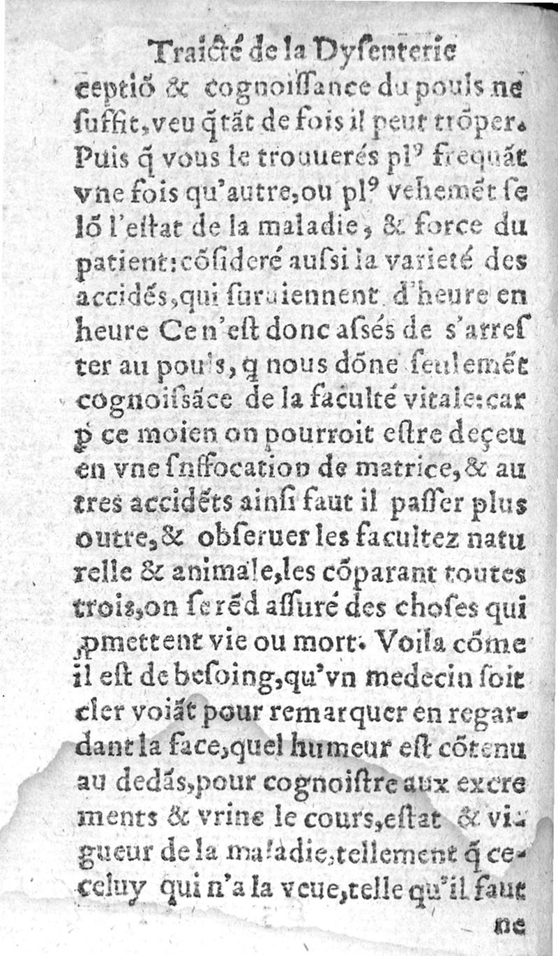 Traicté de la dysenterie, et cure d’icelle, divisé en deux parties : l’une contenant la maladie, Causes, et Symptomes d’icelle : l’autre la Curation. Composé par Guillaume Souviros, Docteur en la faculté de Medecine de Montpellier, et Medecin en Tolose,