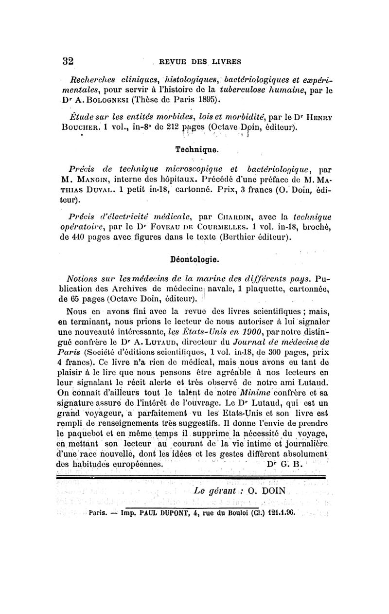 1896, n° 001. - Paris : Doin, 1896.