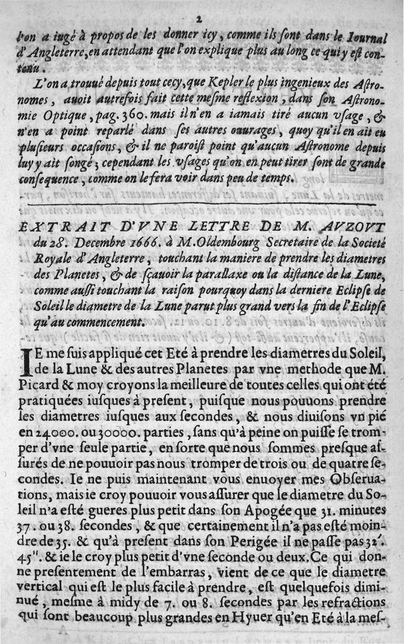 Extrait d'une lettre de M. Auzout... touchant la maniere de prendre les diametres des planetes... Maniere exacte pour prendre le diametre des planetes...