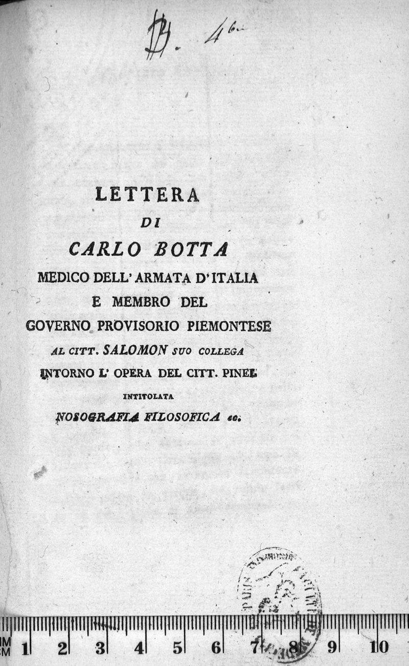 Lettera di Carlo Botta, medico dell'armata d'Italia e membro del governo provisorio piemontese al citt. Salomon suo collega intorno l'opera del citt. Pinel intitolata Nosografia filosofica