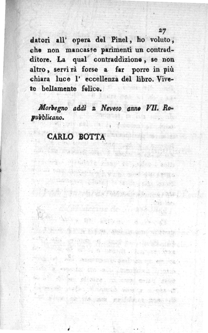 Lettera di Carlo Botta, medico dell'armata d'Italia e membro del governo provisorio piemontese al citt. Salomon suo collega intorno l'opera del citt. Pinel intitolata Nosografia filosofica