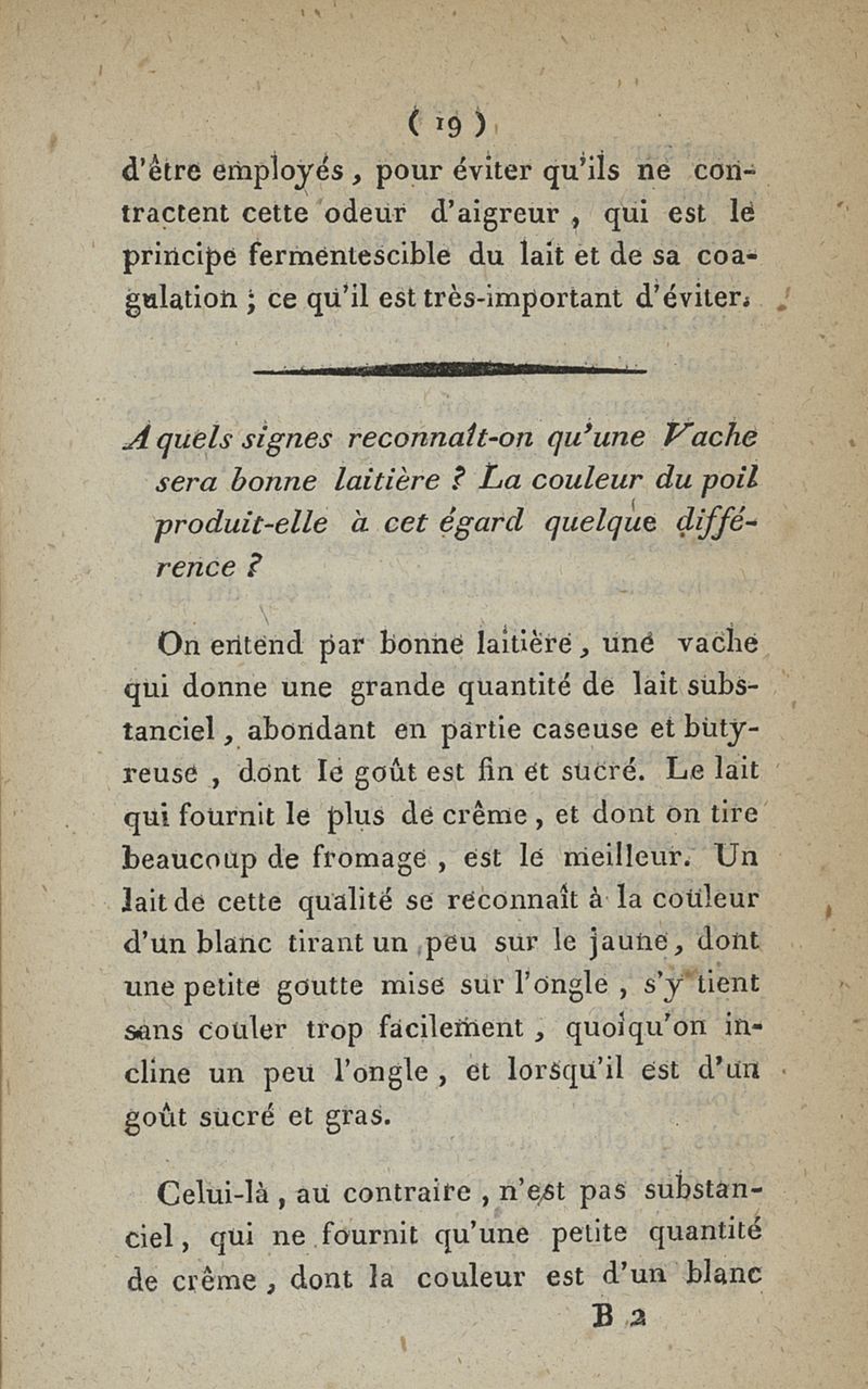 Description des Emplacements qu'il faut choisir de préférence pour la construction des Laiteries, suivie de l'énumération des signes auxquels on reconnaît si une Vache sera bonne laitière