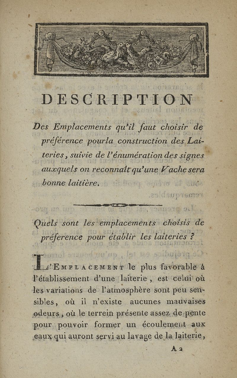 Description des Emplacements qu'il faut choisir de préférence pour la construction des Laiteries, suivie de l'énumération des signes auxquels on reconnaît si une Vache sera bonne laitière