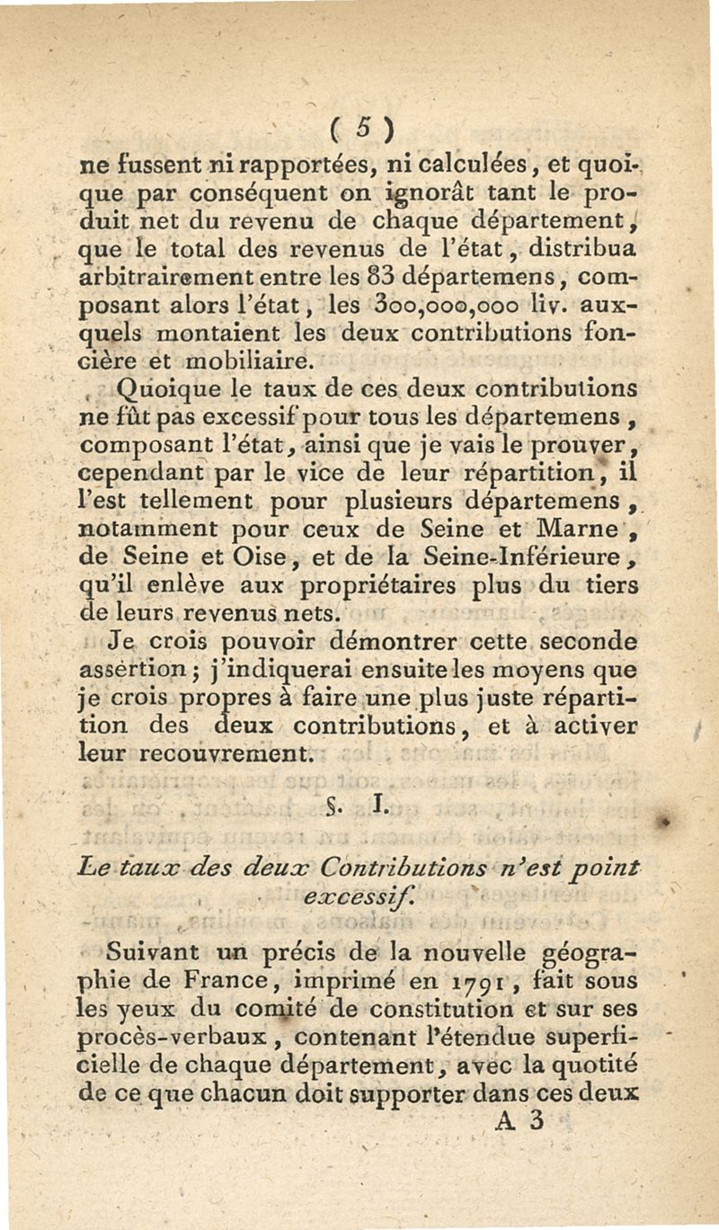 Observations et calculs très importans pour le gouvernement et les gouvernés, sur les contributions foncière et mobiliaire, sur l'organisation des administrations municipales, et sur le droit de passe...