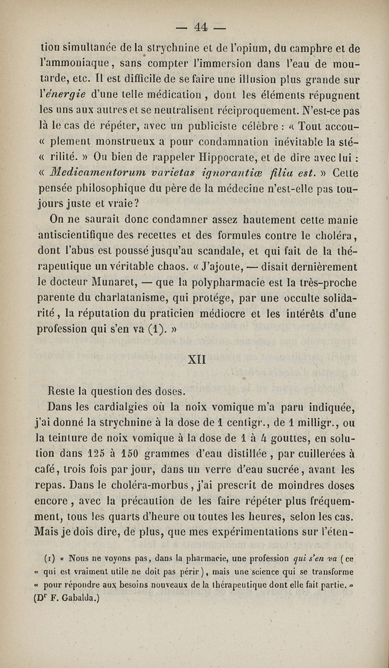 Thérapeutique expérimentale : étude sur les effets et les indications de la strychnine et de la noix vomique dans le traitement du choléra, suivie d'une réponse aux sophismes d'un adversaire