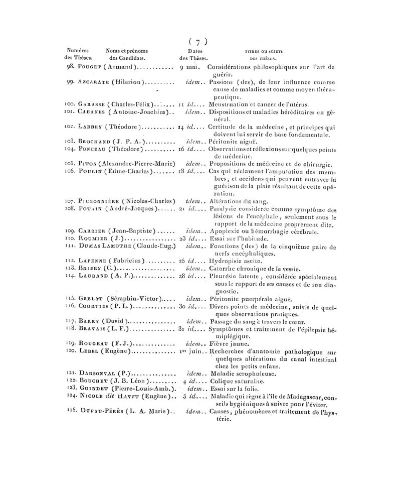 Tables (la Ière chronologique et les deux autres alphabétiques) des thèses soutenues à la Faculté de Médecine de Paris, dans le cours de 1827, rédigées par M. Debraux…