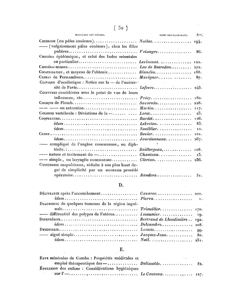 Tables (la Ière chronologique et les deux autres alphabétiques) des thèses soutenues à la Faculté de Médecine de Paris, dans le cours de 1829, rédigées par M. Veret…