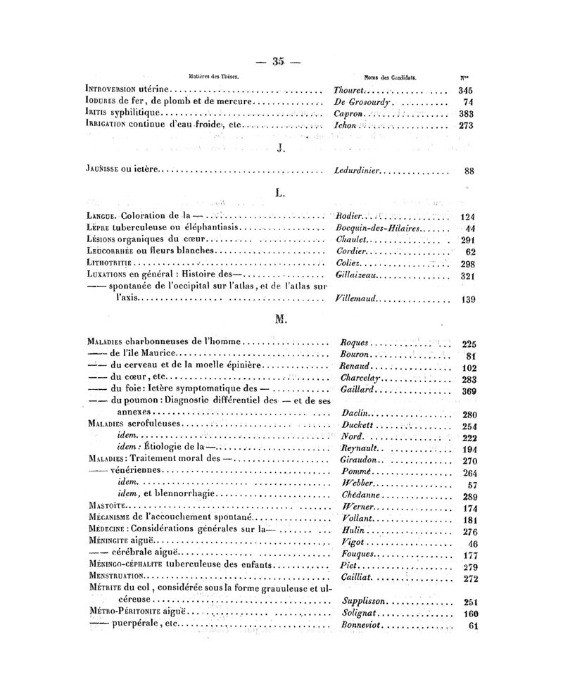 Tables (la Ière chronologique et les deux autres alphabétiques) des thèses soutenues à la Faculté de Médecine de Paris, dans le cours de 1836, rédigées par M. Veret…