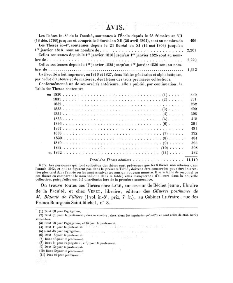 Tables (la première des auteurs, et la deuxième des matières) des thèses soutenues à la Faculté de Médecine de Paris, dans le cours de 1842, rédigées par M. Veret…