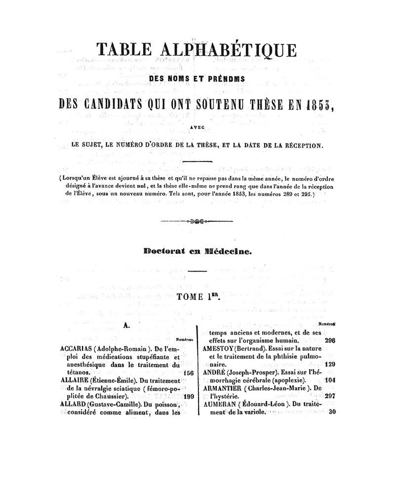 Tables (la première des noms des auteurs, et la seconde des matières) des thèses soutenues à la Faculté de Médecine de Paris, en 1853