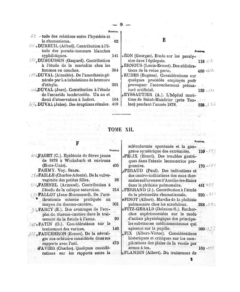 Tables (la première des noms des auteurs, et la seconde des matières) des thèses soutenues à la Faculté de Médecine de Paris, en 1880