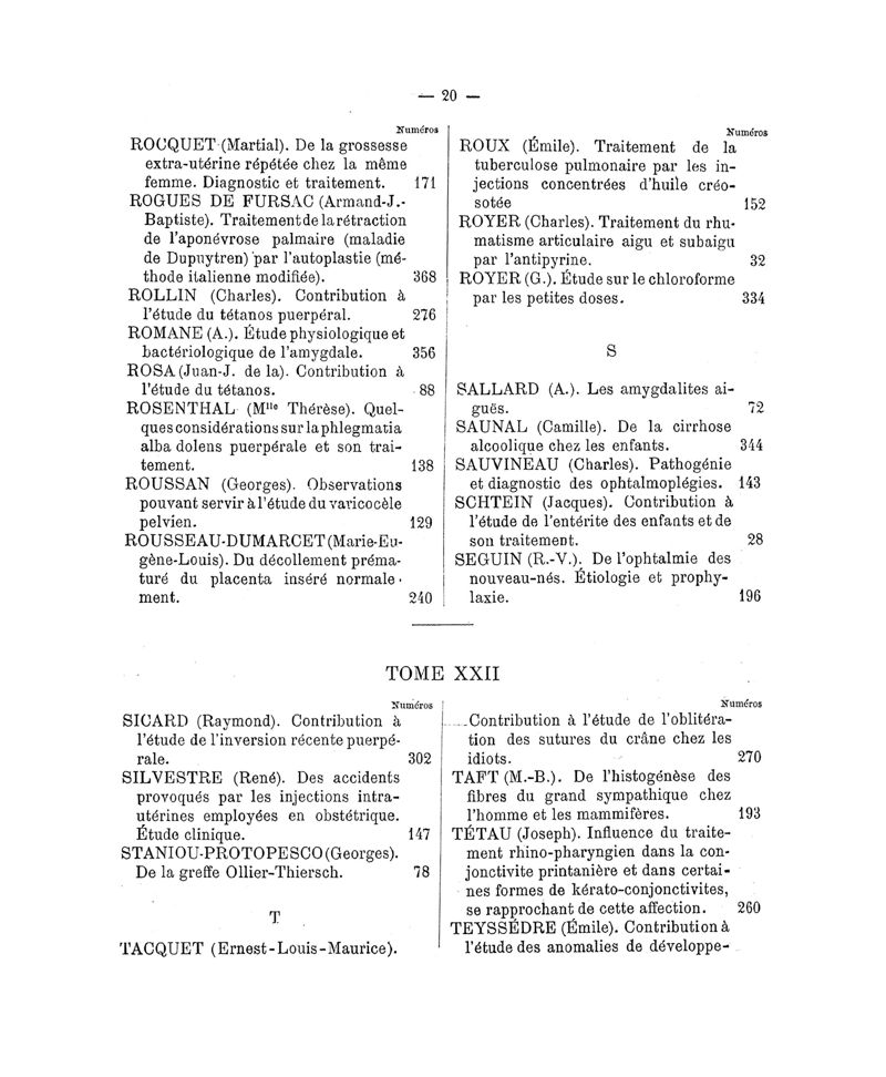 Tables (la première des noms des auteurs, et la seconde des matières) des thèses soutenues à la Faculté de Médecine de Paris, pendant l'année scolaire 1891-1892