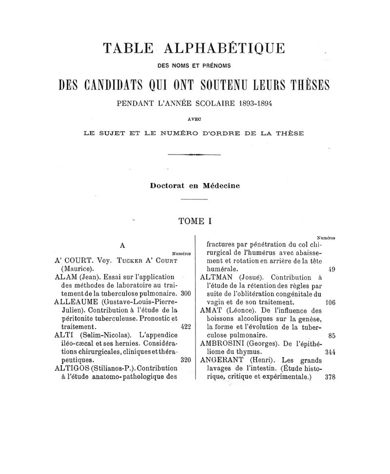Tables (la première des noms des auteurs, et la seconde des matières) des thèses soutenues à la Faculté de Médecine de Paris, pendant l'année scolaire 1893-1894