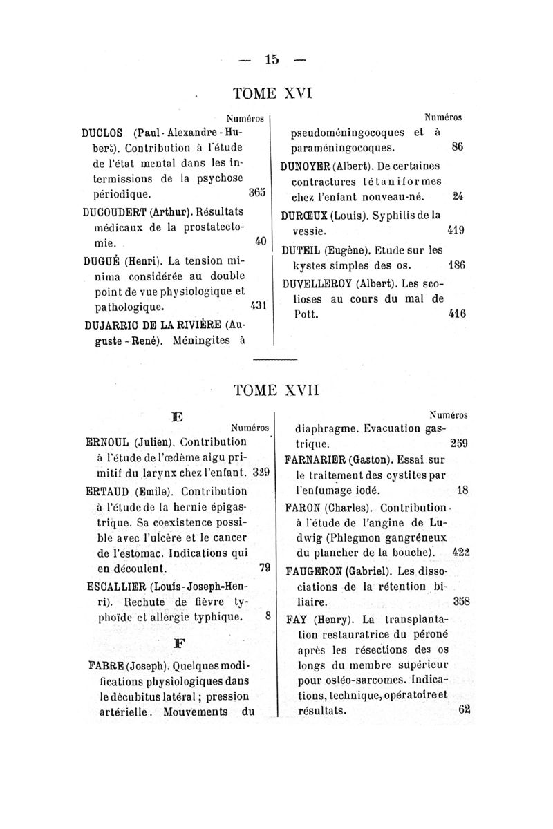 Tables (la première des noms des auteurs, et la seconde des matières) des thèses soutenues à la Faculté de Médecine de Paris, pendant l'année scolaire 1912-1913