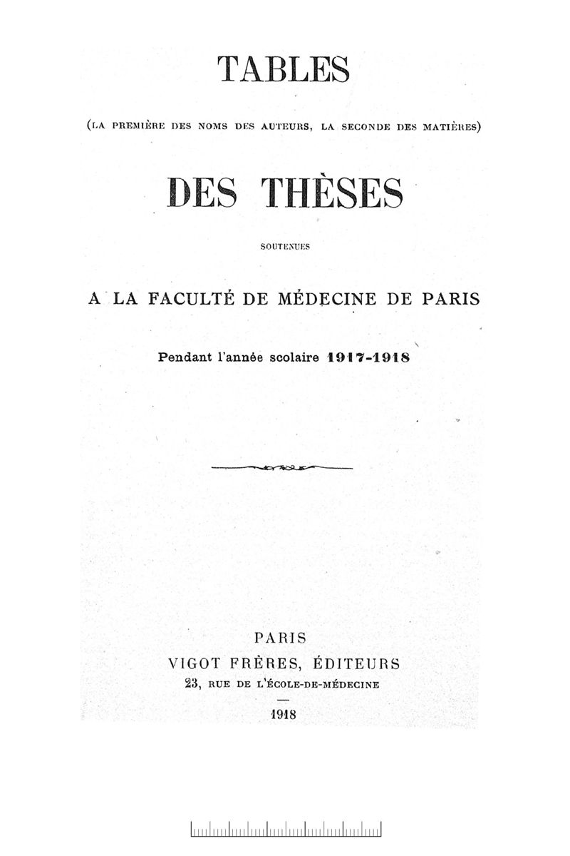 Tables (la première des noms des auteurs, et la seconde des matières) des thèses soutenues à la Faculté de Médecine de Paris, pendant l'année scolaire 1917-1918