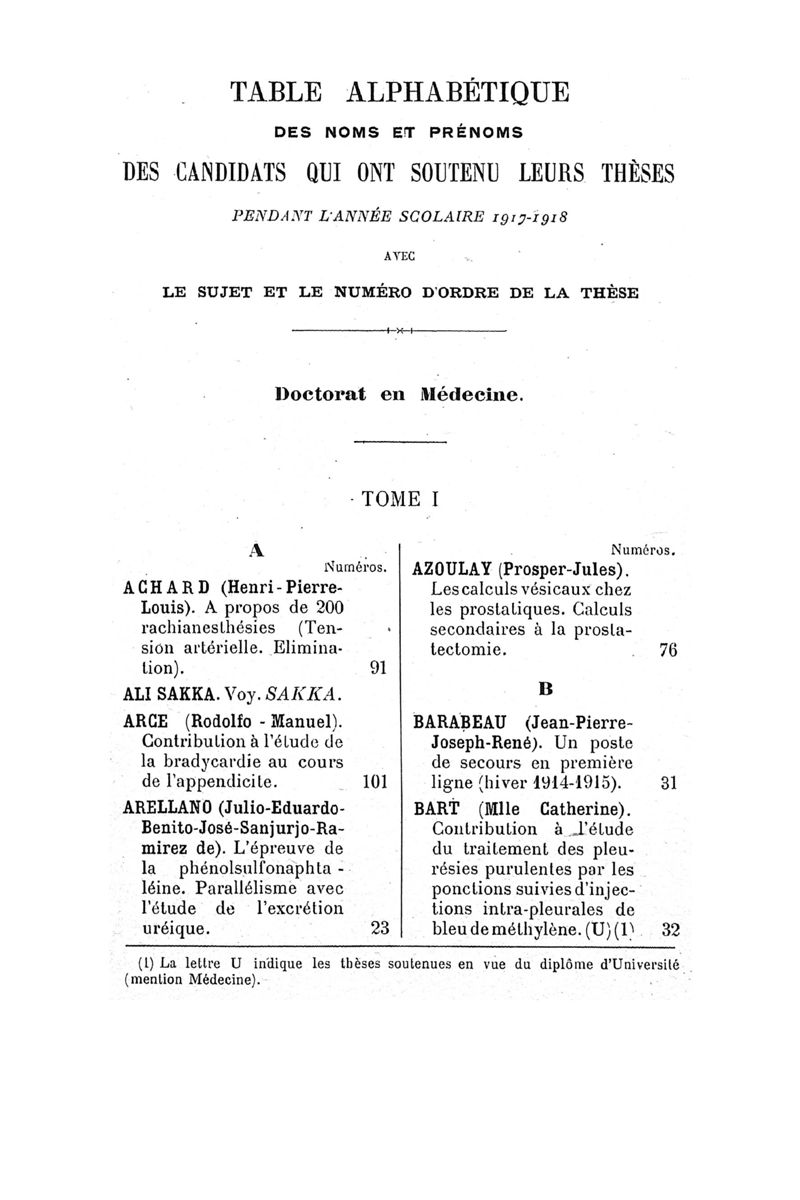 Tables (la première des noms des auteurs, et la seconde des matières) des thèses soutenues à la Faculté de Médecine de Paris, pendant l'année scolaire 1917-1918