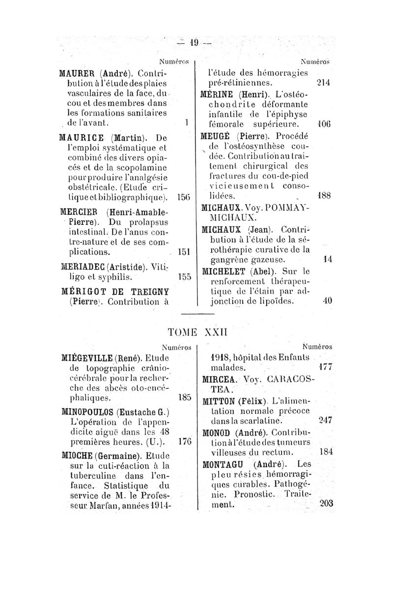 Tables (la première des noms des auteurs, et la seconde des matières) des thèses soutenues à la Faculté de Médecine de Paris, pendant l'année scolaire 1918-1919