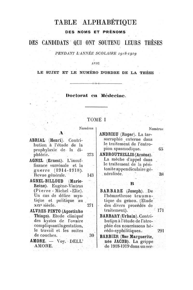 Tables (la première des noms des auteurs, et la seconde des matières) des thèses soutenues à la Faculté de Médecine de Paris, pendant l'année scolaire 1918-1919