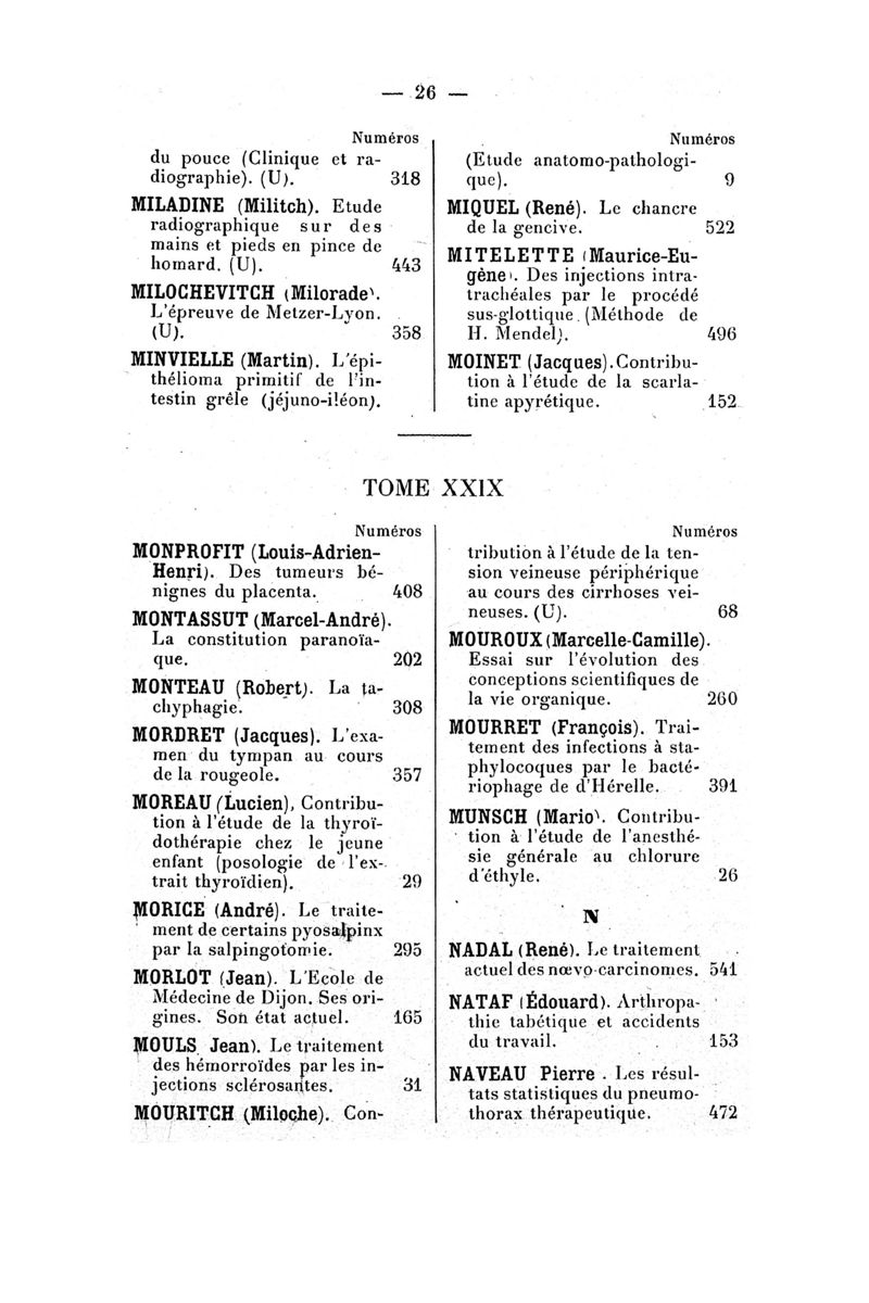Tables (la première des noms des auteurs, et la seconde des matières) des thèses soutenues devant la Faculté de Médecine de Paris en 1924