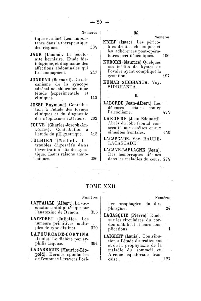 Tables (la première des noms des auteurs, et la seconde des matières) des thèses soutenues devant la Faculté de Médecine de Paris en 1928