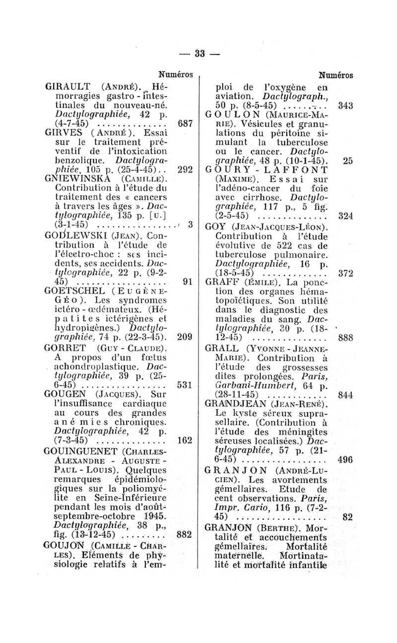 Tables des thèses soutenues devant la Faculté de médecine de Paris en 1945 publiées par les soins du Docteur André Hahn…