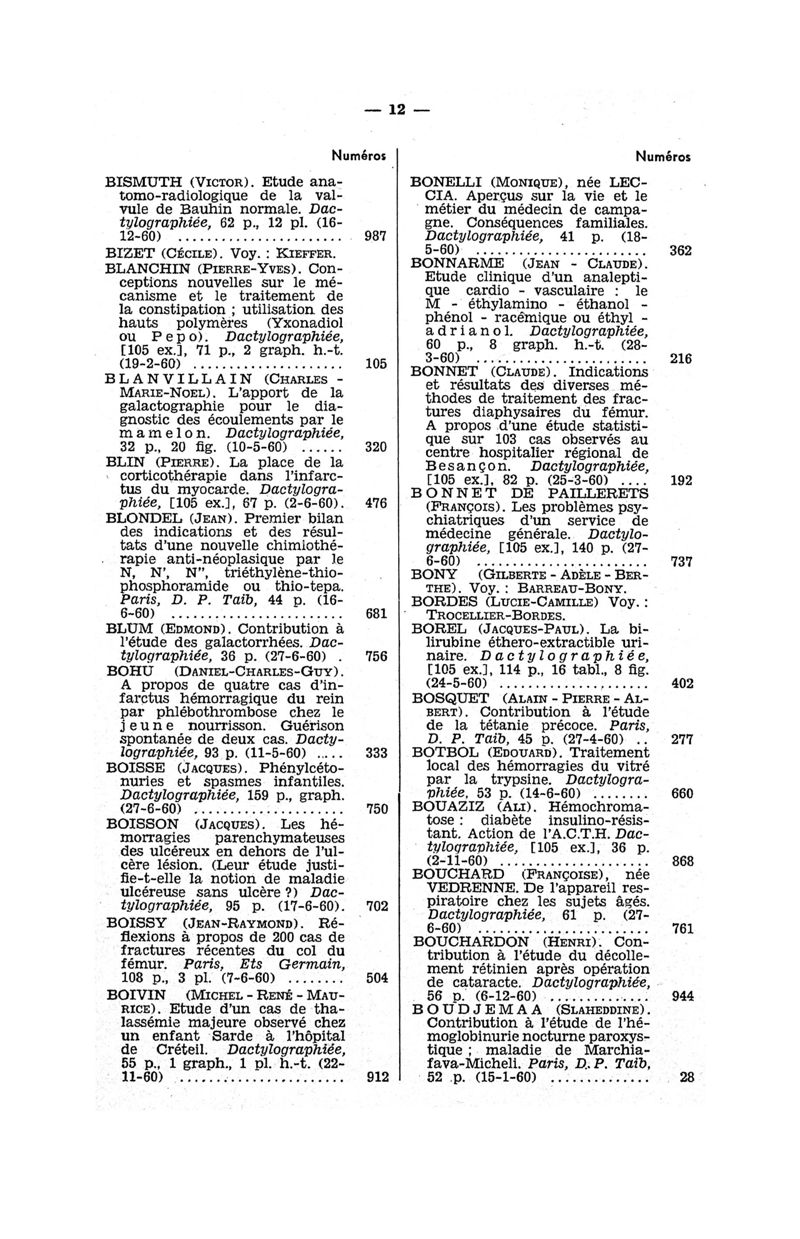 Tables des thèses soutenues devant la Faculté de médecine de Paris en 1960 publiées par les soins du Docteur André Hahn…, avec la collaboration de Mlle G. Le Noir…