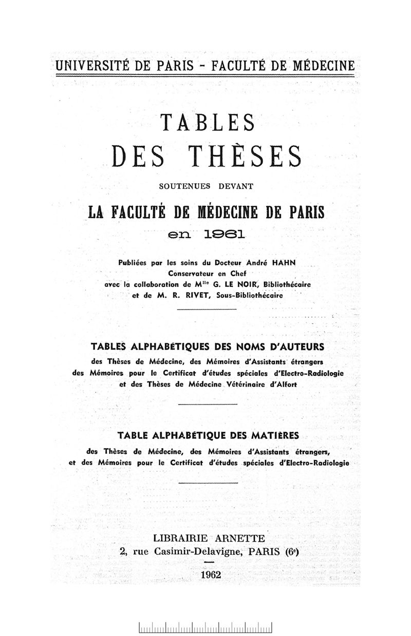 Tables des thèses soutenues devant la Faculté de médecine de Paris en 1961 publiées par les soins du Docteur André Hahn…, avec la collaboration de Mlle G. Le Noir…