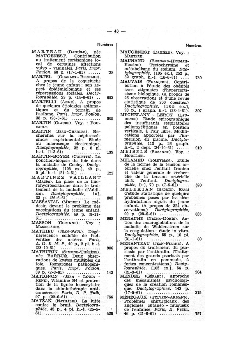 Tables des thèses soutenues devant la Faculté de médecine de Paris en 1961 publiées par les soins du Docteur André Hahn…, avec la collaboration de Mlle G. Le Noir…
