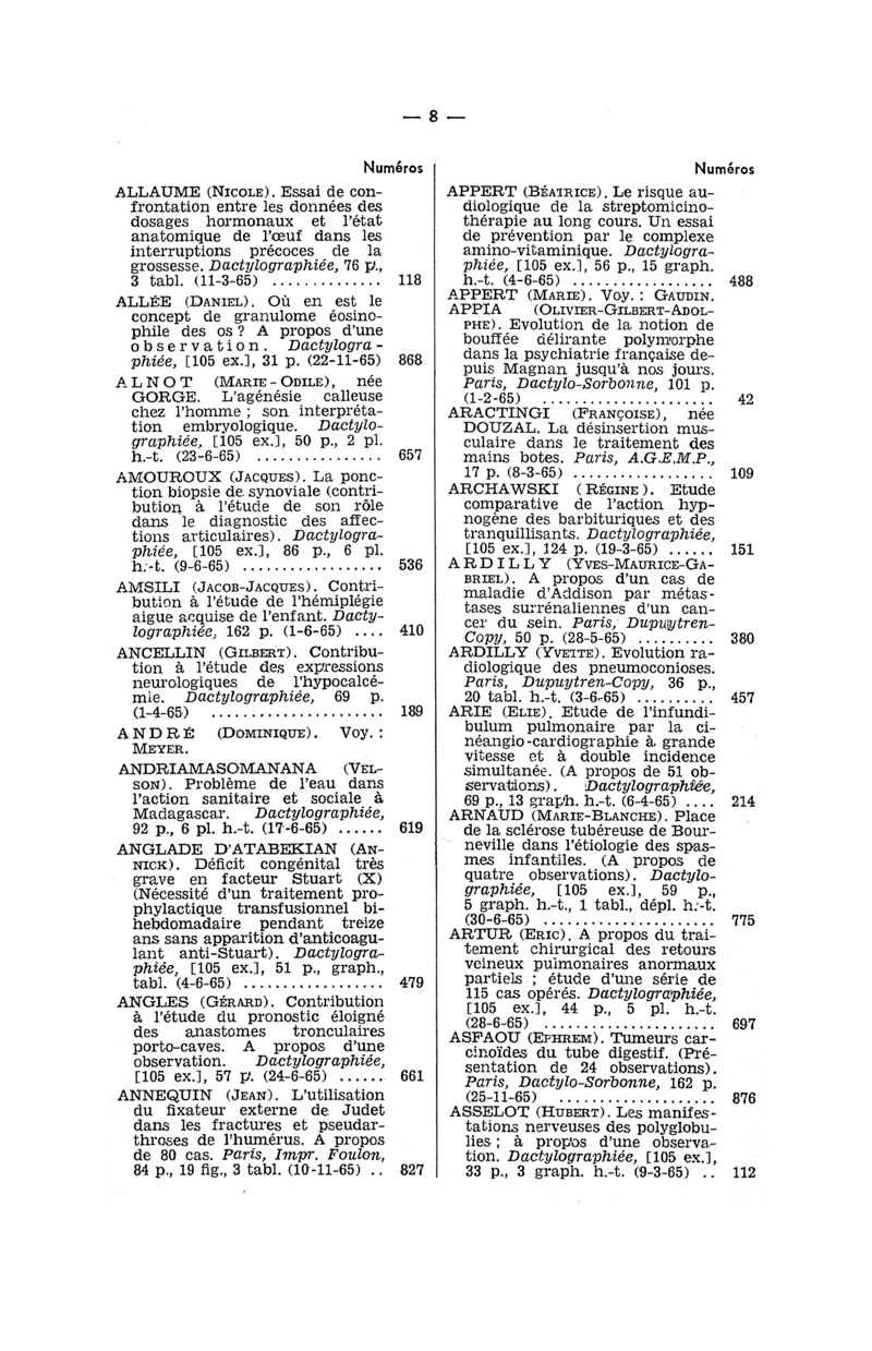Tables des thèses soutenues devant la Faculté de médecine de Paris en 1965 publiées par les soins du Docteur André Hahn…, avec la collaboration de Mlle G. Le Noir…
