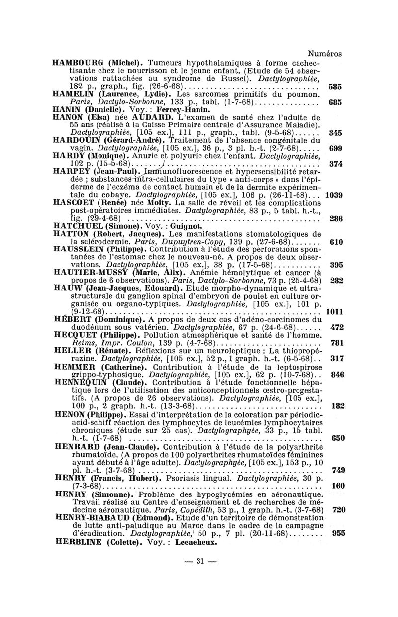 Tables des thèses soutenues devant la Faculté de médecine de Paris en 1968 publiées par les soins du Docteur André Hahn…, avec la collaboration de Mlle G. Le Noir…