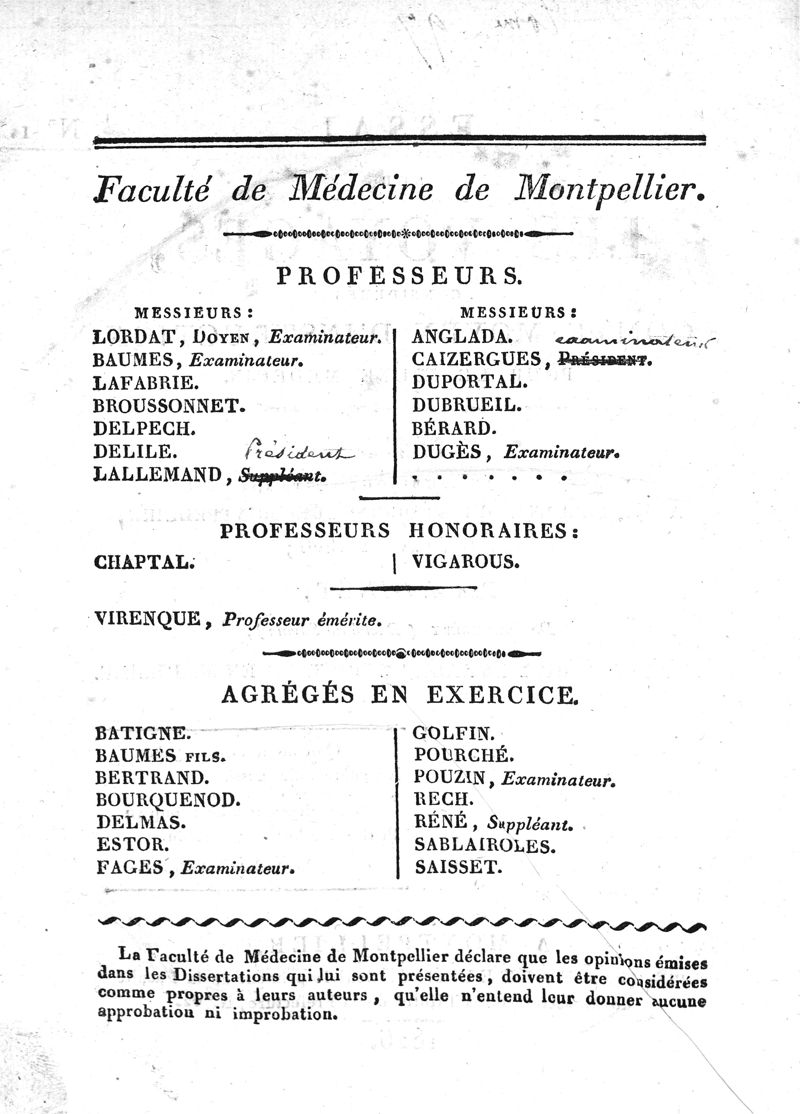 Thèse de médecine de Montpellier n°1, 1826,