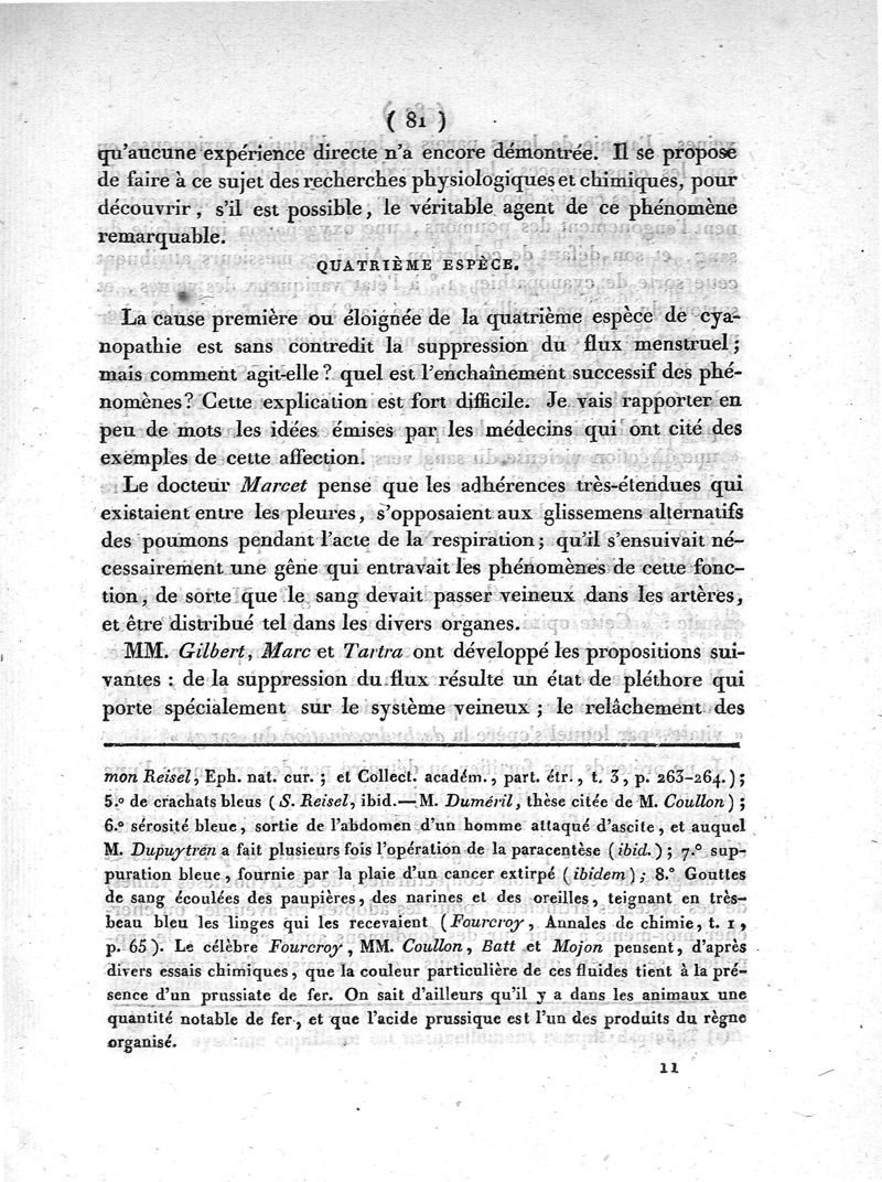 Recherches analytiques sur diverses affections dans lesquelles la peau présente une coloration bleue, et en particulier sur celles que l'on a désignées sous les noms de cyanose ou maladie bleue