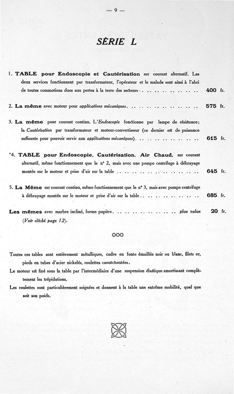 Tableaux pour endoscopie, cautérisation, air chaud, galvanisation, faradisation, courant sinusoïdal, courants permanents et rythmés